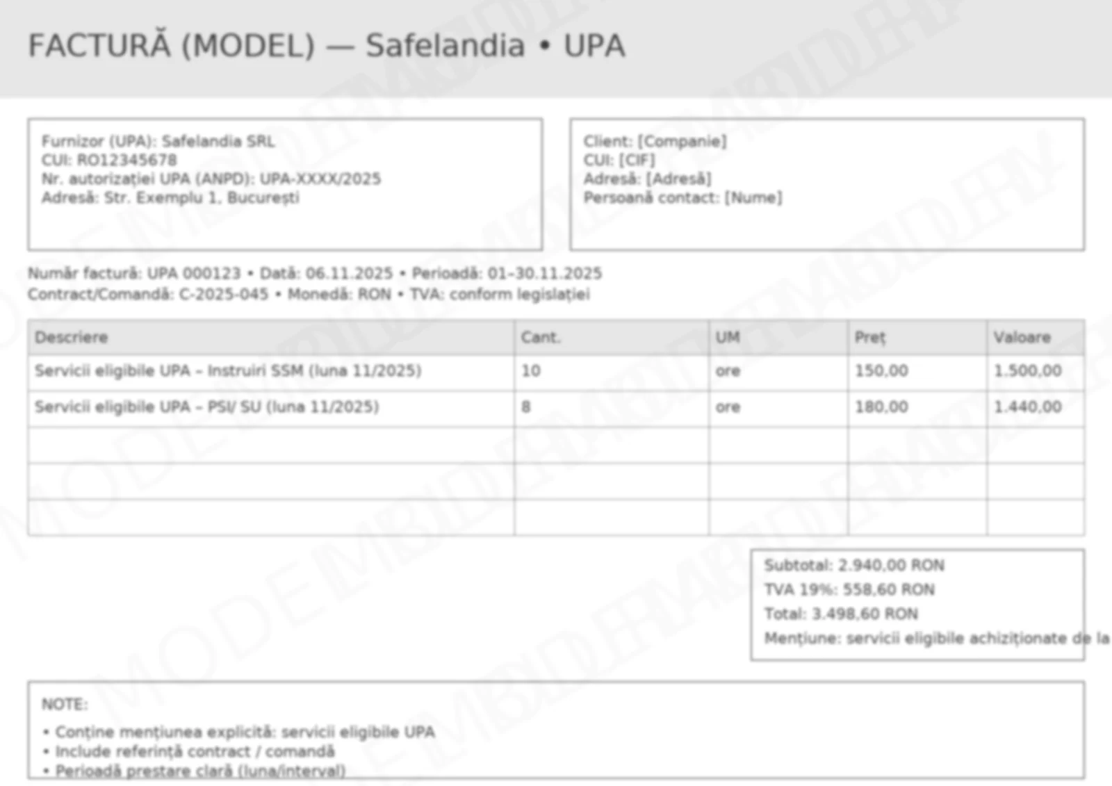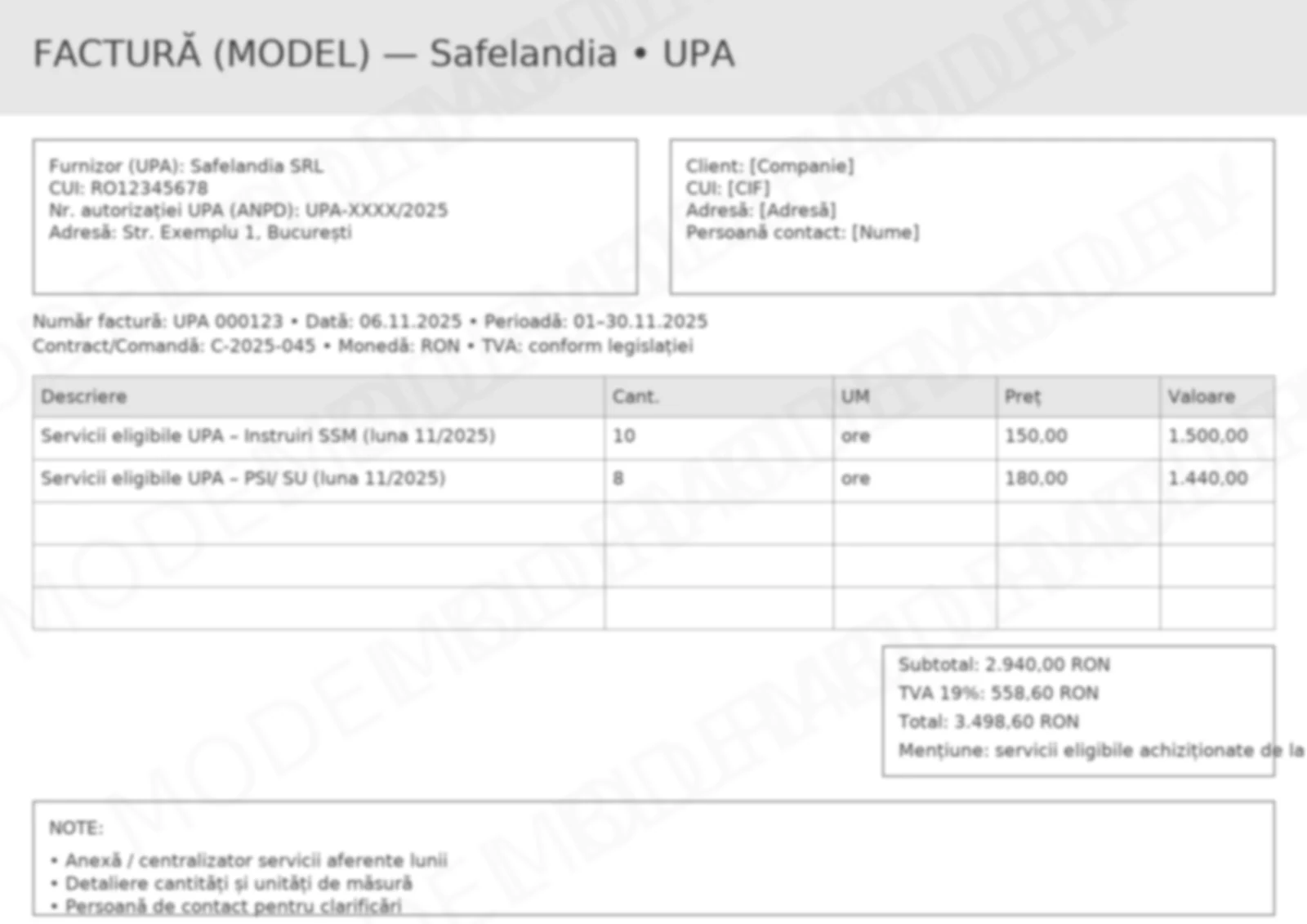 • Descriere clară a serviciilor eligibile UPA (ex.: „Instruiri SSM”, „Servicii PSI”) + luna și referința contract/comandă